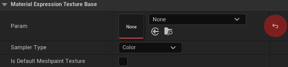With the Texture Parameter node selected, look for the Material Expression Texture Base section in the Details panel on the bottom left of the editor. To assign a default material, click on the small curved arrow icon located on the right side of the Param row.