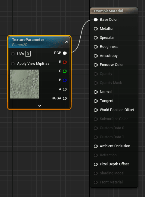 Finally, connect the TextureParameter output pin to the Base Color input pin of the ExampleMaterial. Make sure to save the material before closing the window or tab.