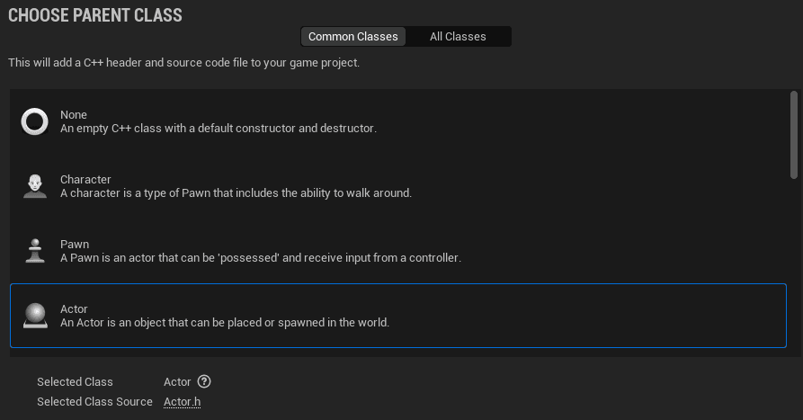 In the Content Browser, enter the C++ Classes folder of your project. Right-click on the folder and select Add New C++ Class. From the pop-up window, select Actor as the parent class and name the class RemoteImagePlane