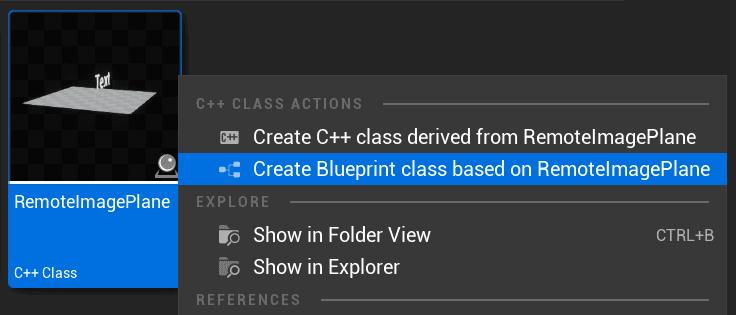 To do this, right-click on the class in the Content Browser and select Create Blueprint Class Based on RemoteImagePlane from the context menu. Name the new Blueprint class BP_RemoteImagePlane