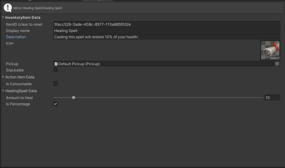 The Use function checks again that the User has Health and is not Dead. It then calls Health.Heal() with a value of either the AmountToHeal in points, or a percentage of the user’s Max Health depending on if IsPercentage is checked.
