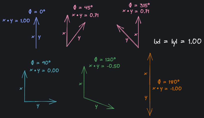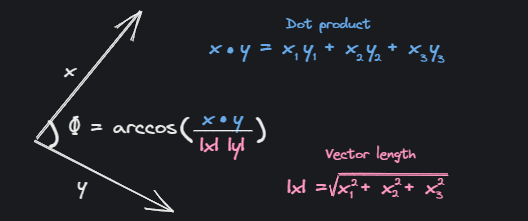 Unity have us covered here, once again with Vector3.Distance, and also with Vector3.Dot methods. There's also Vector3.Angle method for cases when dot product is not enough. That's nice, even though the math behind it is relatively basic. I'm including it here, as a little bonus: