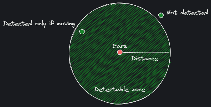 With Sense as a base class, the Ears class derived from it is actually pretty simple, all it needs is to provide overwrite for HasDetected method where true is returned when detectable is within the Distance and its flag CanBeHear is set.