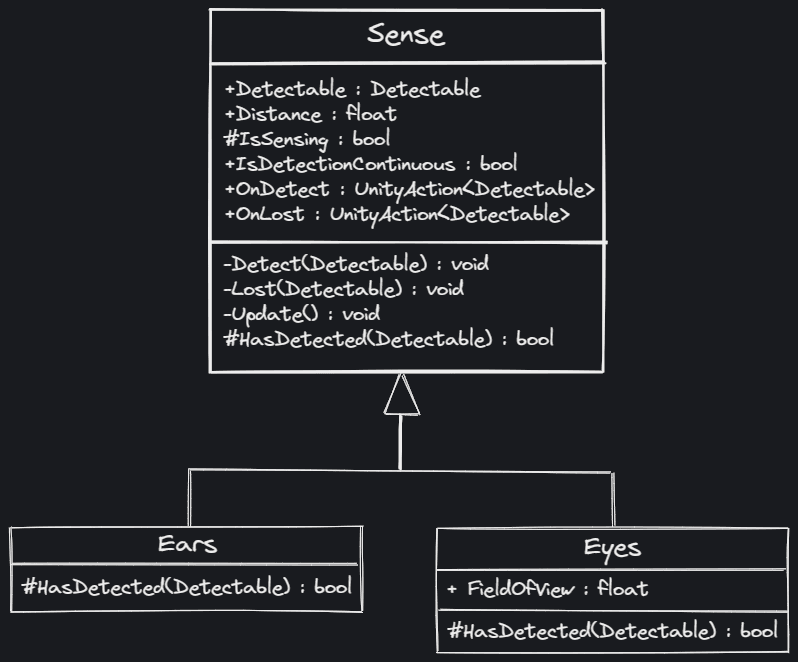 In the Sense class code below, notice how we have no logic in the protected virtual HasDetected method. Because we won't be attaching to any GameObject the base class itself, but its child classes Eyes and Ears which overwrites this method with their own logic as we'll soon see.