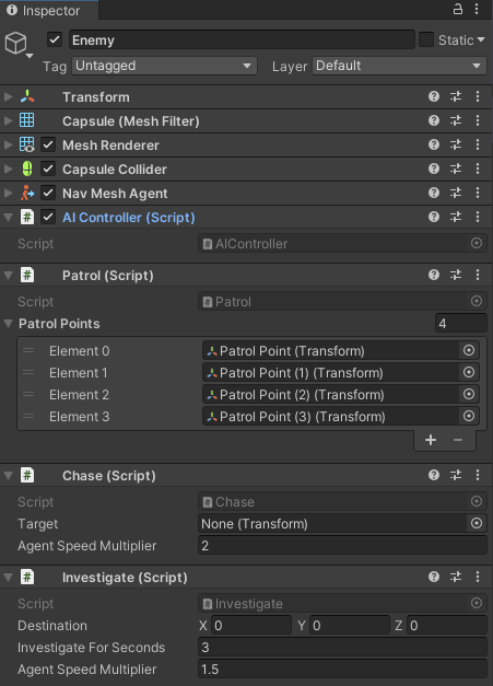 The implementation consists of AIController class, that governs a Unity NavMeshAgent according to a currently selected behavior. Concrete behaviors, Patrol, Chase and Investigate, are derived from an AIBehavior base class and AIController has an instance of each one of them.