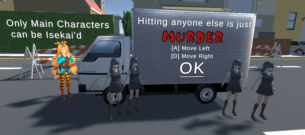 Description: This game is based on an anime trope. There is a very popular genre of anime called isekai where characters are sent into another world. It's VERY common for them to be sent to another world by being hit by a truck. If you look up truck-kun you'll see many memes about this trope. For these characters, death is only the beginning as they are propelled into a new world to face the unknown and go on countless adventures! In this game you play as our ACTUAL hero, Truck-Kun!