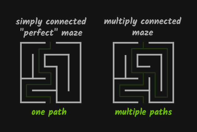 First, I already mentioned that our maze is going to be multiply connected, which means our generator will produce a maze that satisfies the first of these two requirements: