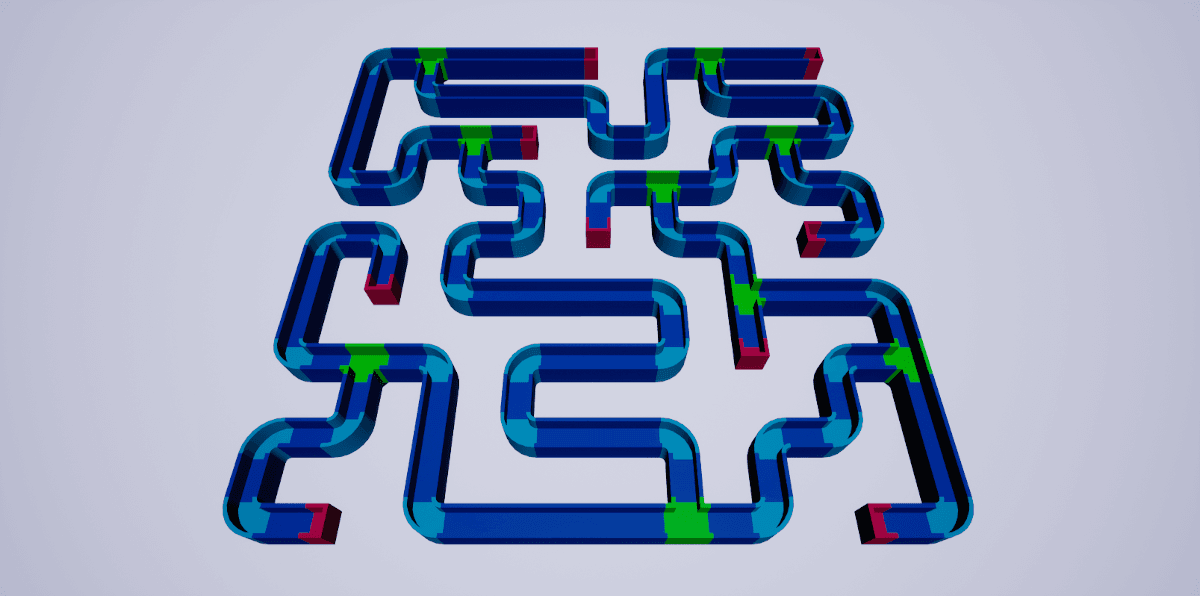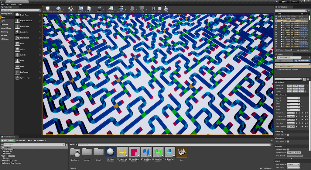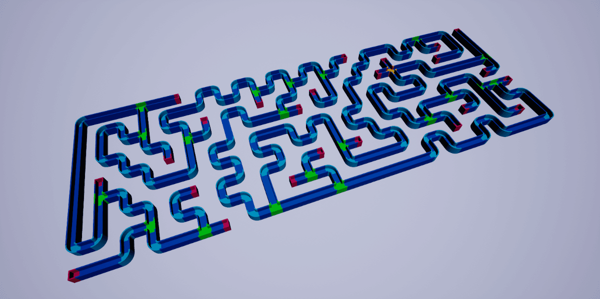 AMazeGenerator, a custom Actor class we're going to build together in this and the following part, will be able to generate a multiply-connected maze from just 5 modular pieces. By the end of the second part, we'll end up with something like this.