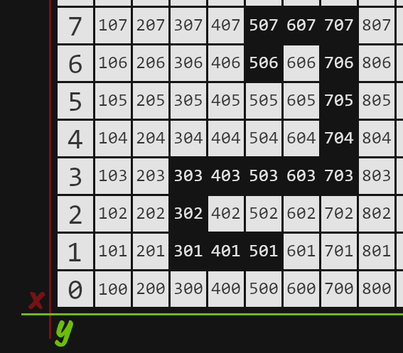 With these values, the execution will look almost the same. The only difference would be in the direction. This time, we'd fall in the switch statement into a case for value 2 (right direction, +Y), and in the end, the elements 707, and 607, will be set to 0, and new parameters we'll pass to the Step function will be 7, 7.