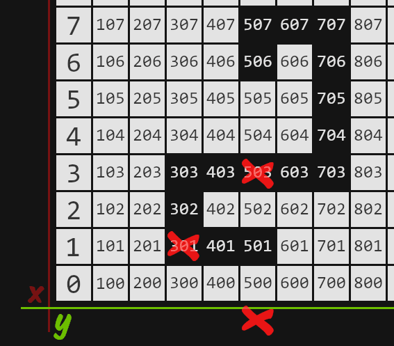 No, the number 7 is not bigger or equal to 99. We're not too close to the upper edge. In fact, our starting position { 5, 5 } is on the opposite side, close to the bottom left corner.