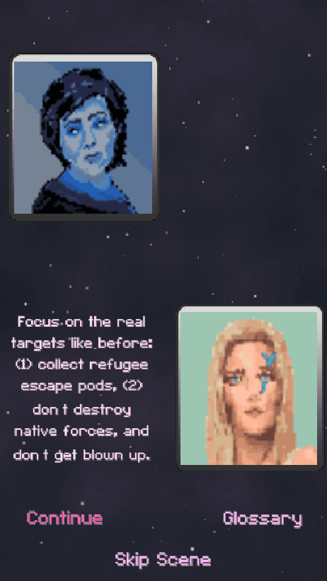 One idea I have is to make both characters more connected to one particular world. Maybe if the player saves enough escape pods from a given world they are saving someone or something important to one of the pilots. This is a way I could connect the narrative to both gameplay as well.