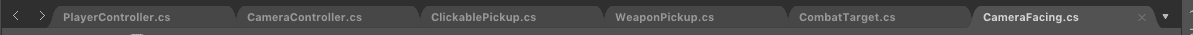 - The script we developed to get enemy health bars to face the camera at all times will break, namely CameraFacing (the last tab in the picture above). You can see the result by playing the game right now. A keen eye will notice that the free look camera never rotates... on a rotating camera...