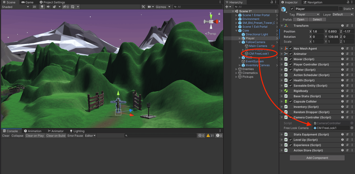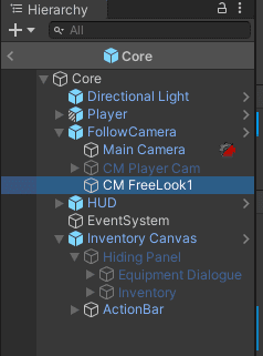 - Add the free look camera to your Core prefab (or camera prefab if you have one, here you can see I disabled my old follow camera from that lecture and now use the free look)