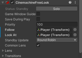- Make sure your fee look camera has a higher priority than anything else, like maybe 100 or something obvious, and assign your Player prefab to the "follow" and "look at". (Remeber to override this priority with your cinematics if you have any.)