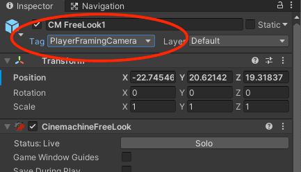 - I will be sharing some code below that will look for this camera by it's tag. You can change the tag on the camera and in the code to anything you want, but if you want to just copy and paste the code, make sure to tag the camera “PlayerFramingCamera” as that's what I used in the below scripts I will share.