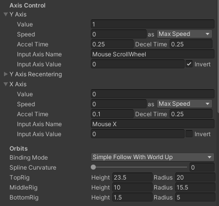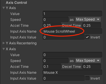 - In the Axis Control section of the free look camera, match your settings to the suggestions in the image below, inverting the X and Y axes to suit your play style. (Challenge: Allow the user to change the X and Y invert options in game in a settings menu!)