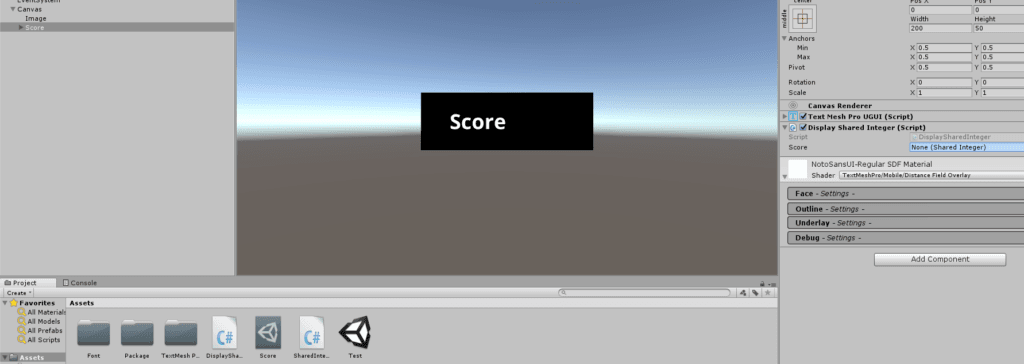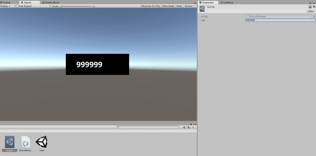 Given this, we can then create a shared integer, and then attach it to any component that needs to either change the score, or use it in some way. Let’s get back to that score display. We will create a simple script to display any Shared Integer, shown below.