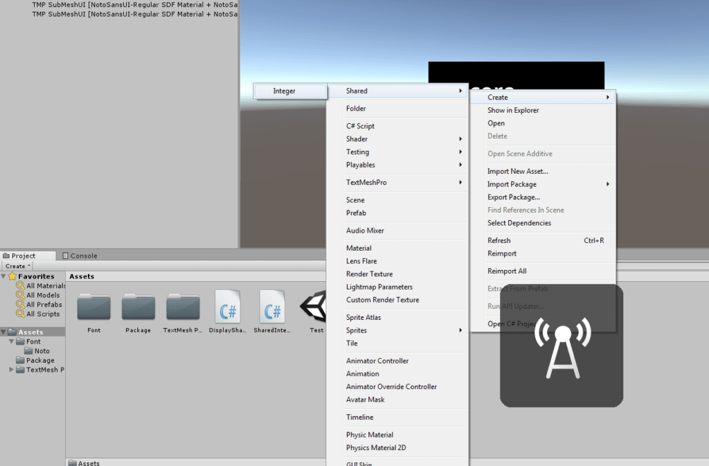 We then create an shared integer, which I will name Score. Right click in your Assets package, just as you would do to create a material.